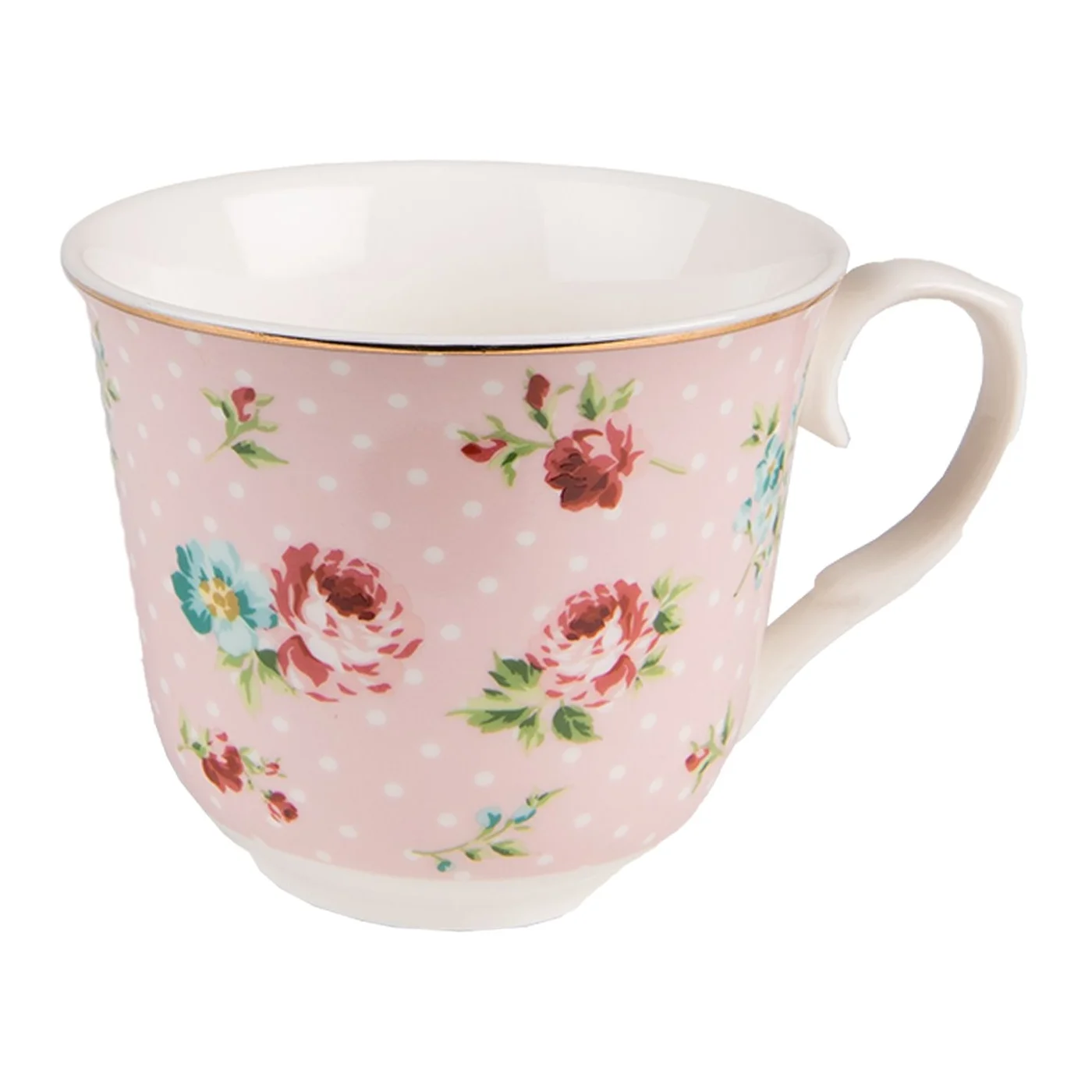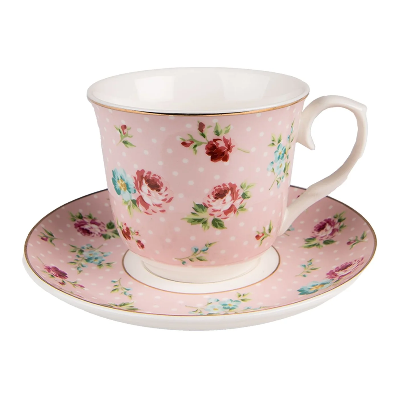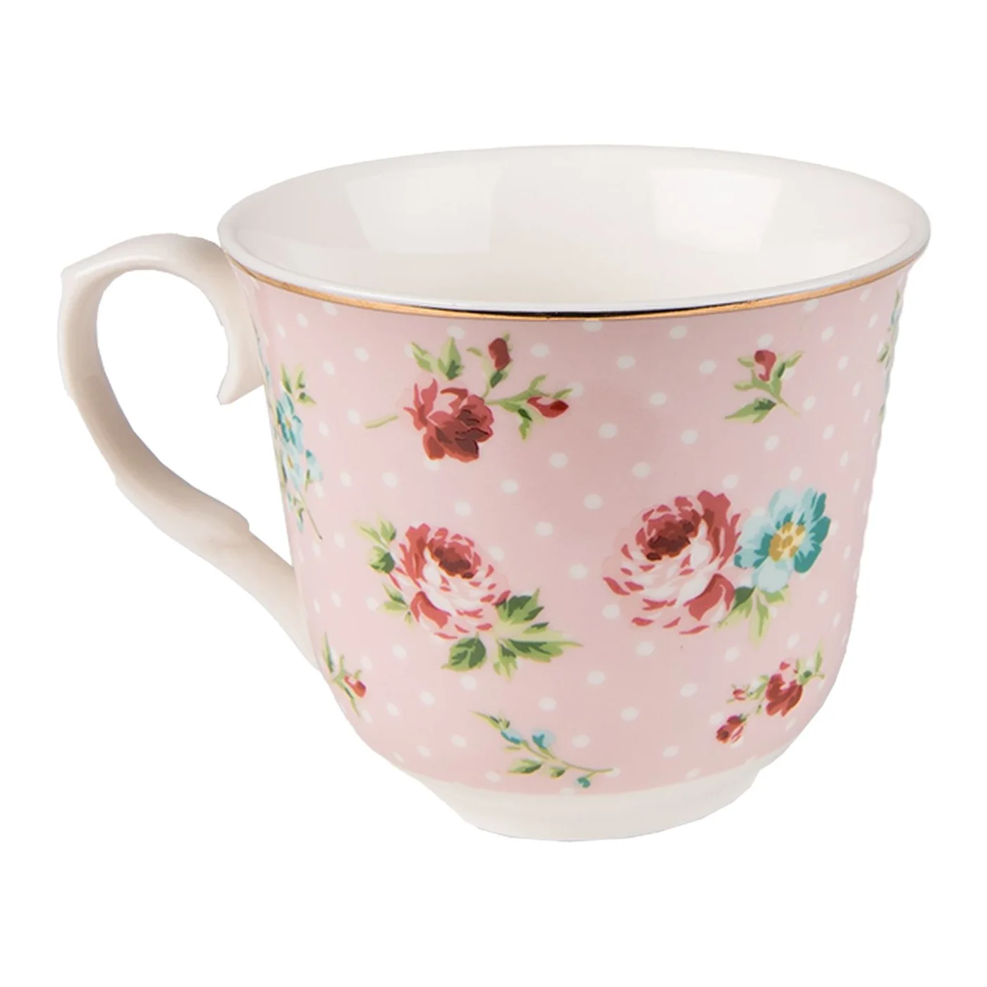 Porceliano puodelis, retro stiliaus, mielo rožinio dizaino su baltais taškeliais.
