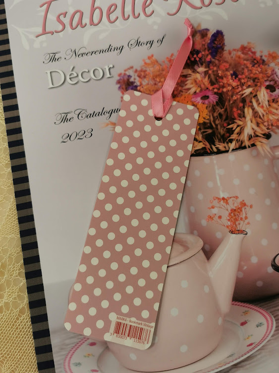 Popierinis knygos skirtukas su rožine juostele. Vintažinio dizaino, viena pusė rožėta, kita Polka Dot dekoro.