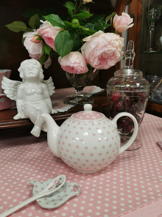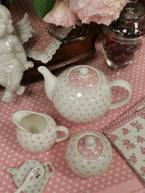 Mielas retro stiliaus porceliano arbatinukas su rožiniais tašteliais.