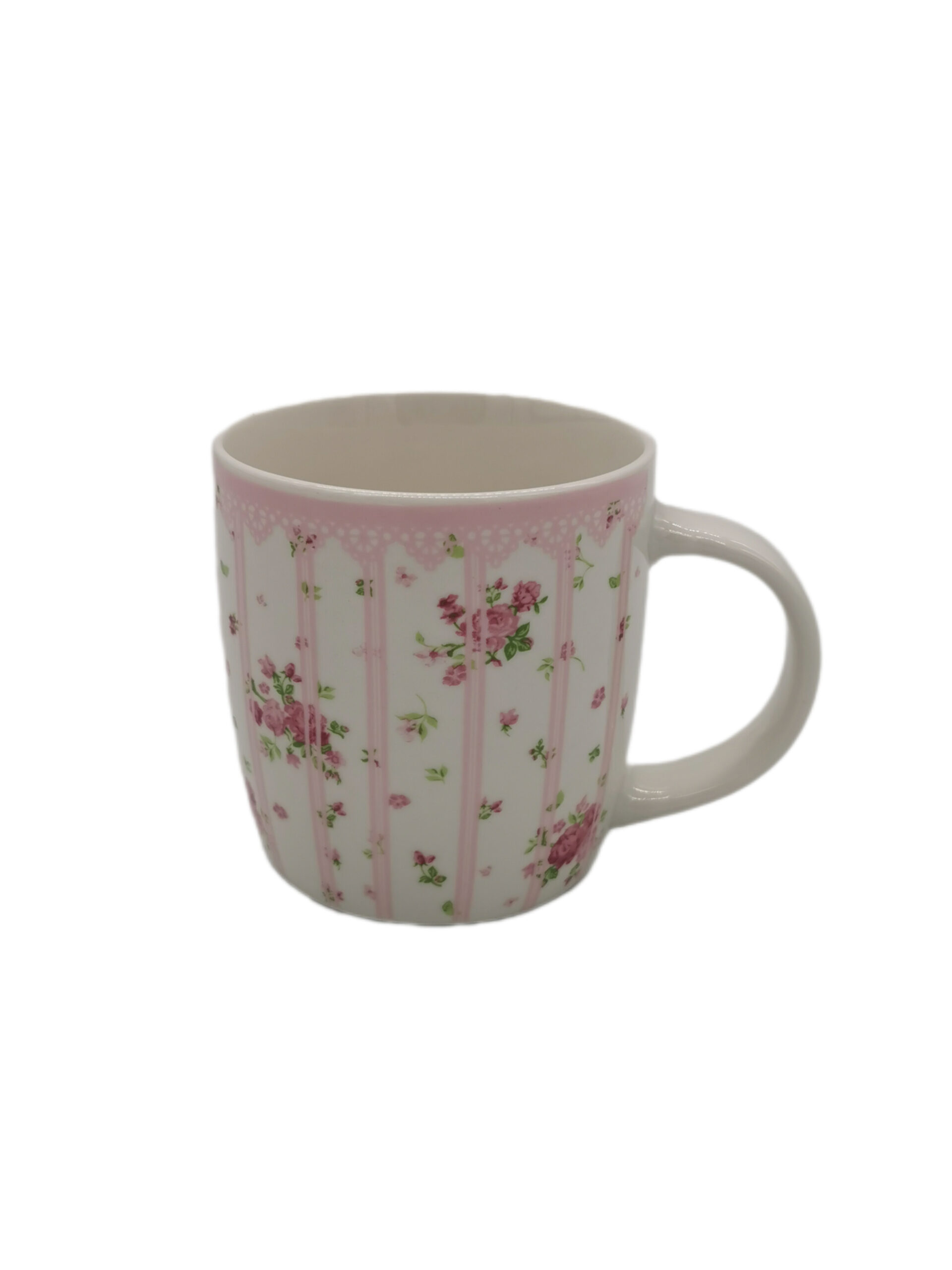 Porceliano puodelis, retro stiliaus, mielo klasikinio dizaino su nėrinukų raštu ir rožytėmis.