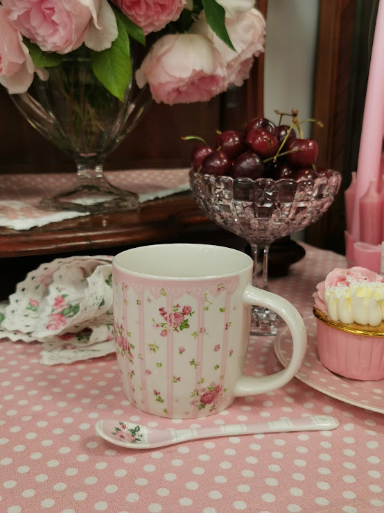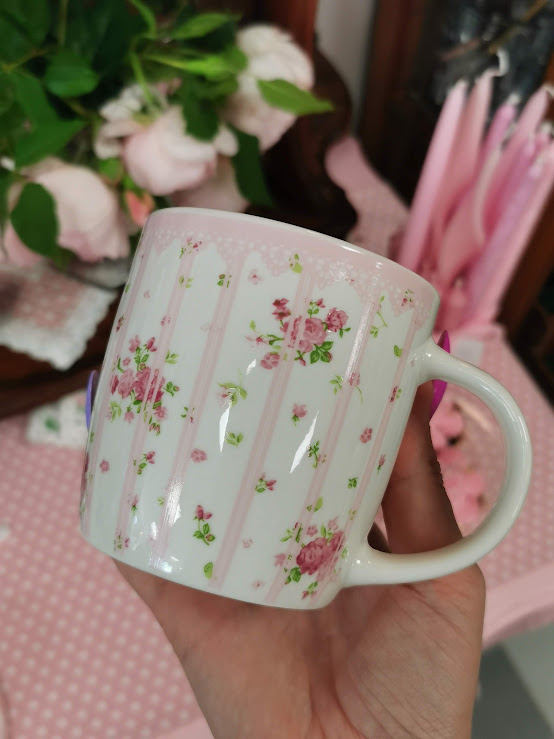 Porceliano puodelis “PROVENCE” 430 ml., retro stiliaus, mielo rožinio dizaino su baltais taškeliais ir rožytėmis.