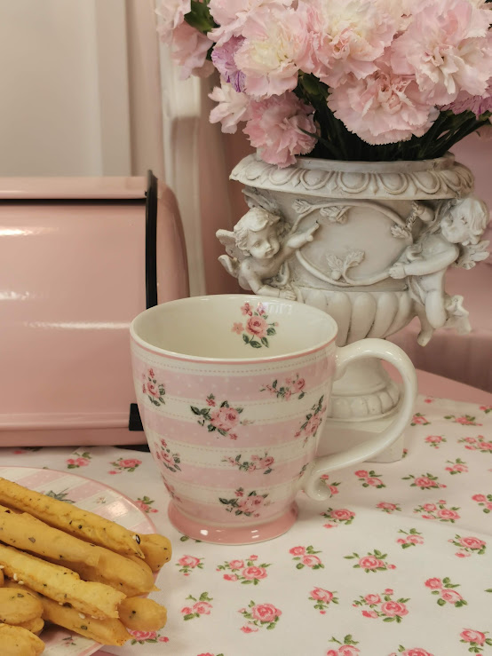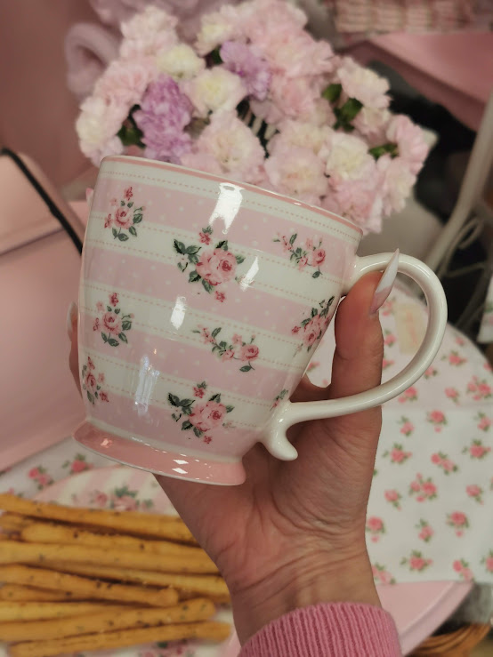 Porceliano puodelis su lėkštele, dekoruoti smulkiomis rožytėmis ir baltais taškeliais. Romantiškas ir labai mielas dizainas. Spalvos ramios, pastelinės ir tikrai jaukios.