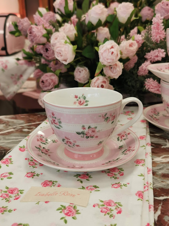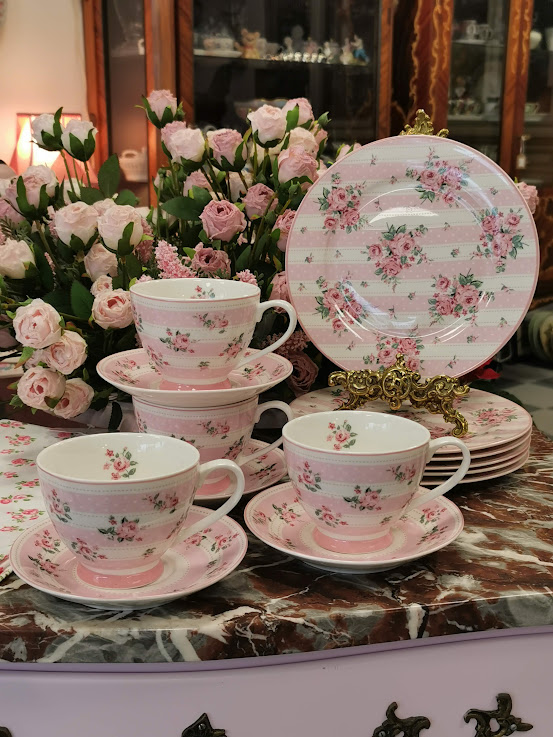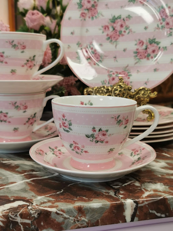 Porceliano puodelis su lėkštele, dekoruoti smulkiomis rožytėmis ir baltais taškeliais. Romantiškas ir labai mielas dizainas. Spalvos ramios, pastelinės ir tikrai jaukios. Itin kokybiškas porcelianas.