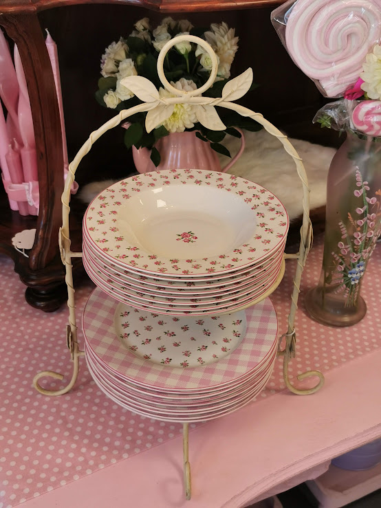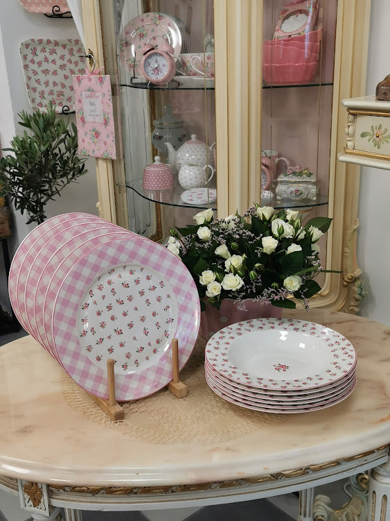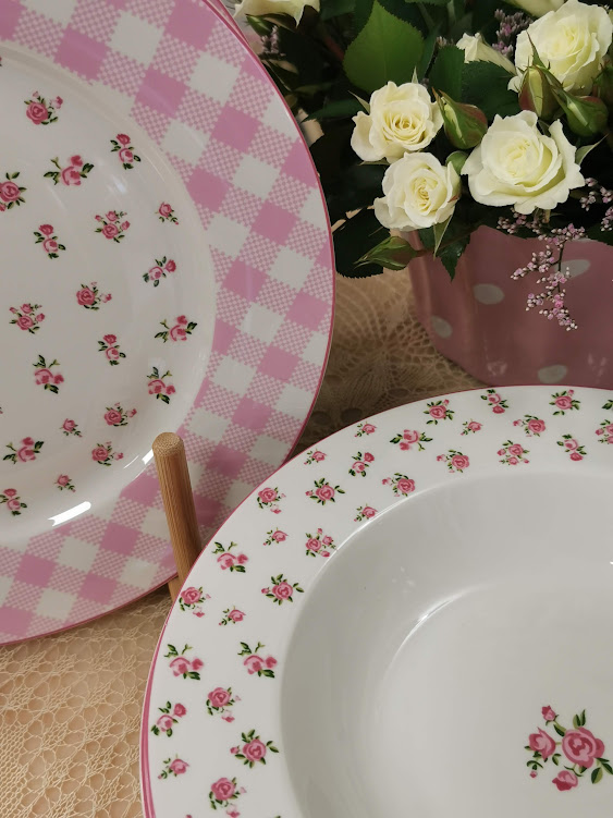 Didelė porceliano lėkštė, dekoruota smulkiomis rožytėmis ir languoto audinio imitacija.