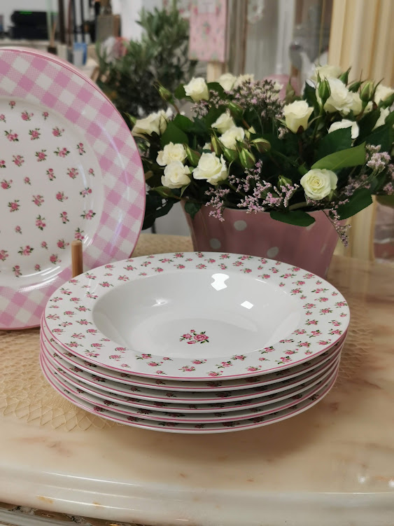 Porceliano lėkštė sriubai, dekoruota smulkiomis rožytėmis.