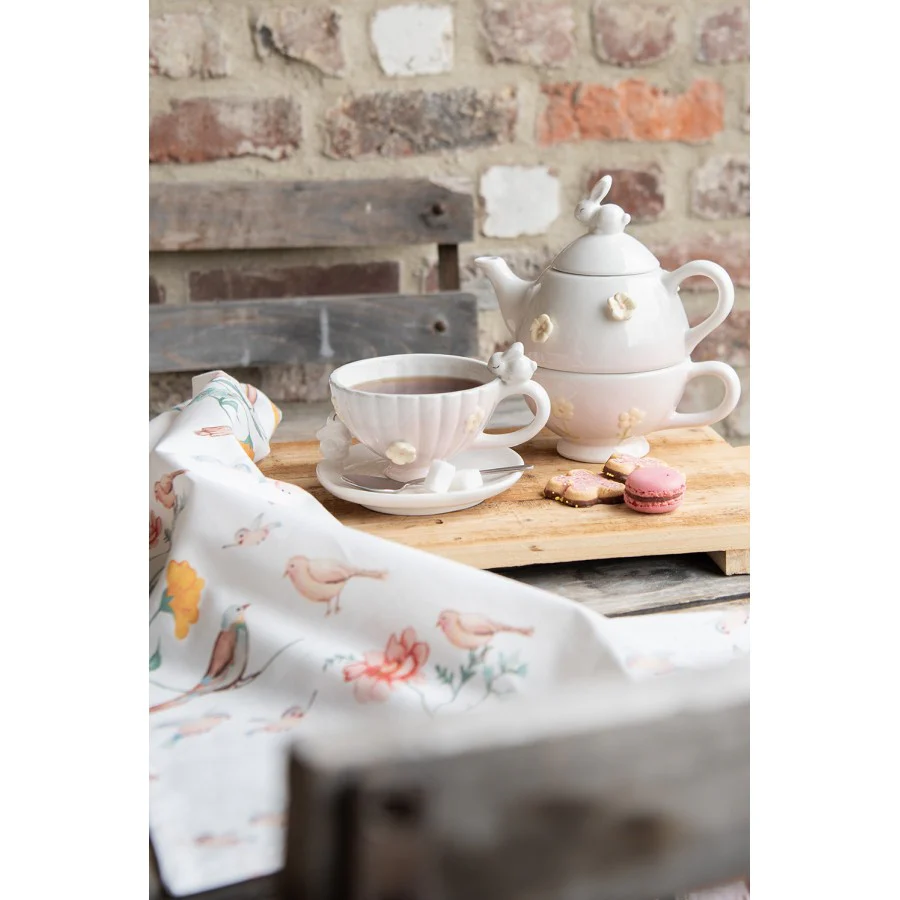 Puodelis ir lėkštutė su zuikučiais