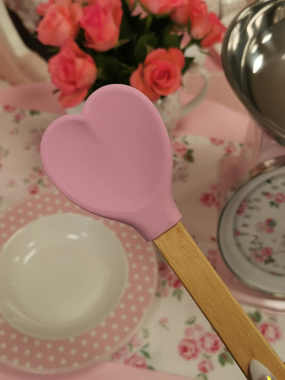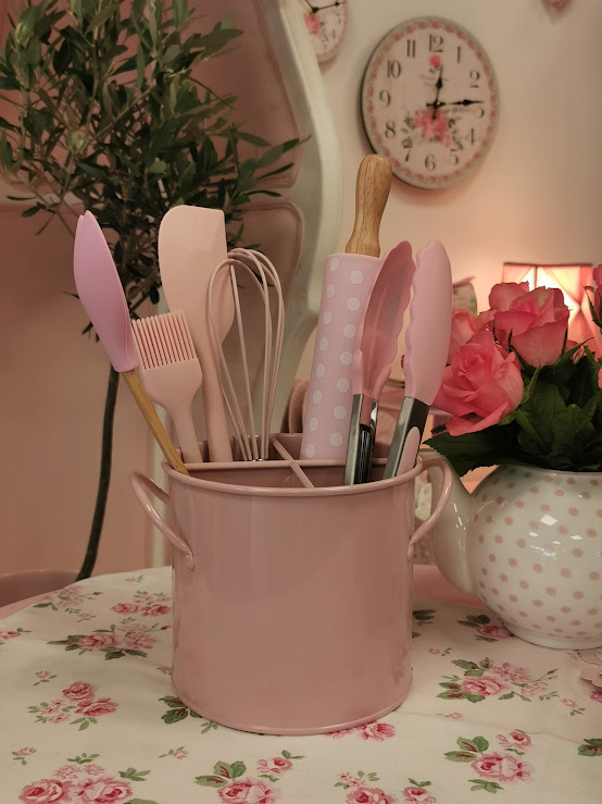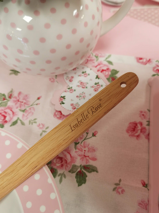 Isabelle Rose rožinis virtuvės įrankis. Tobulas pagalbininkas maisto gaminimui. Su gamintojo logotipu.