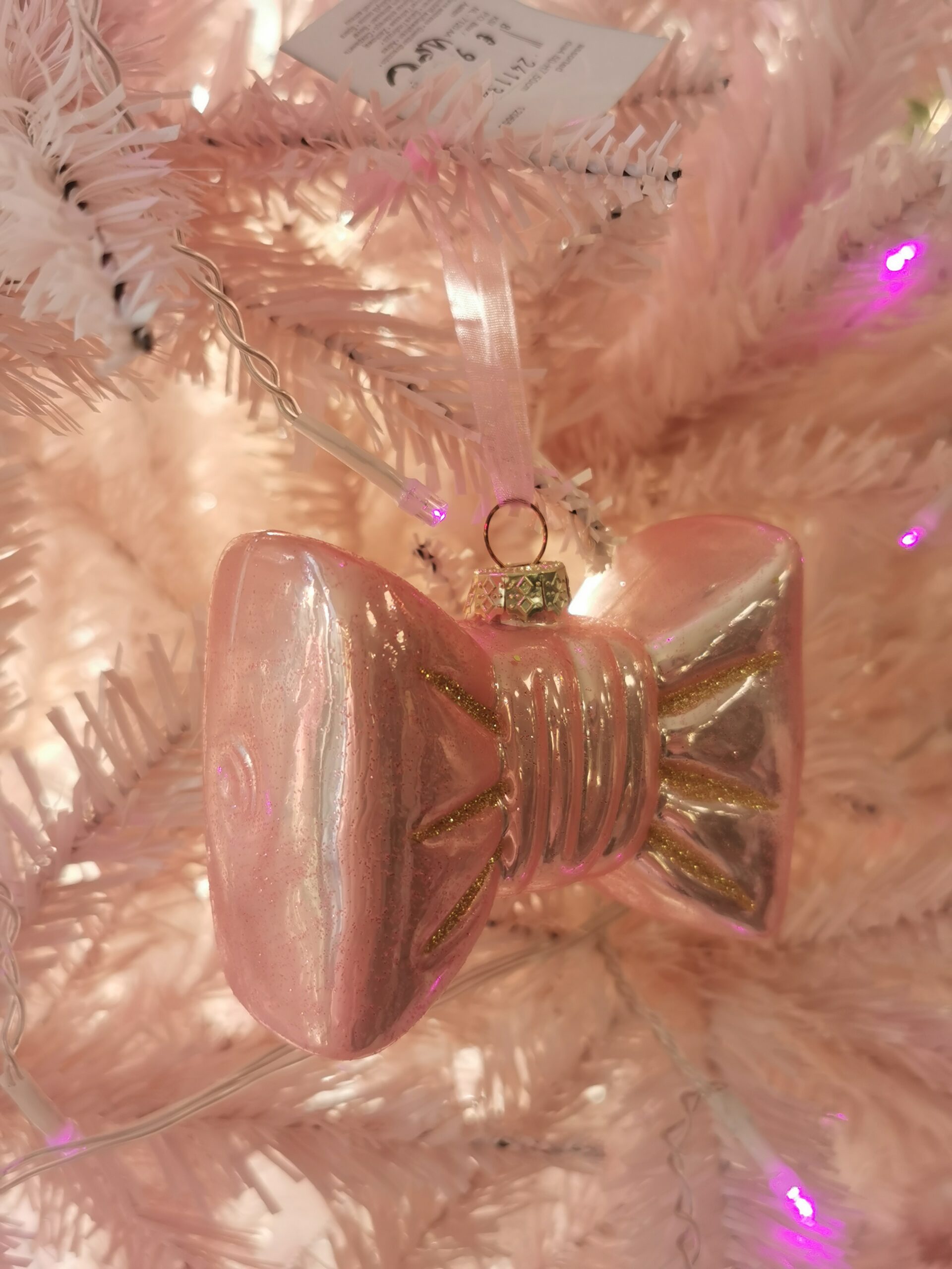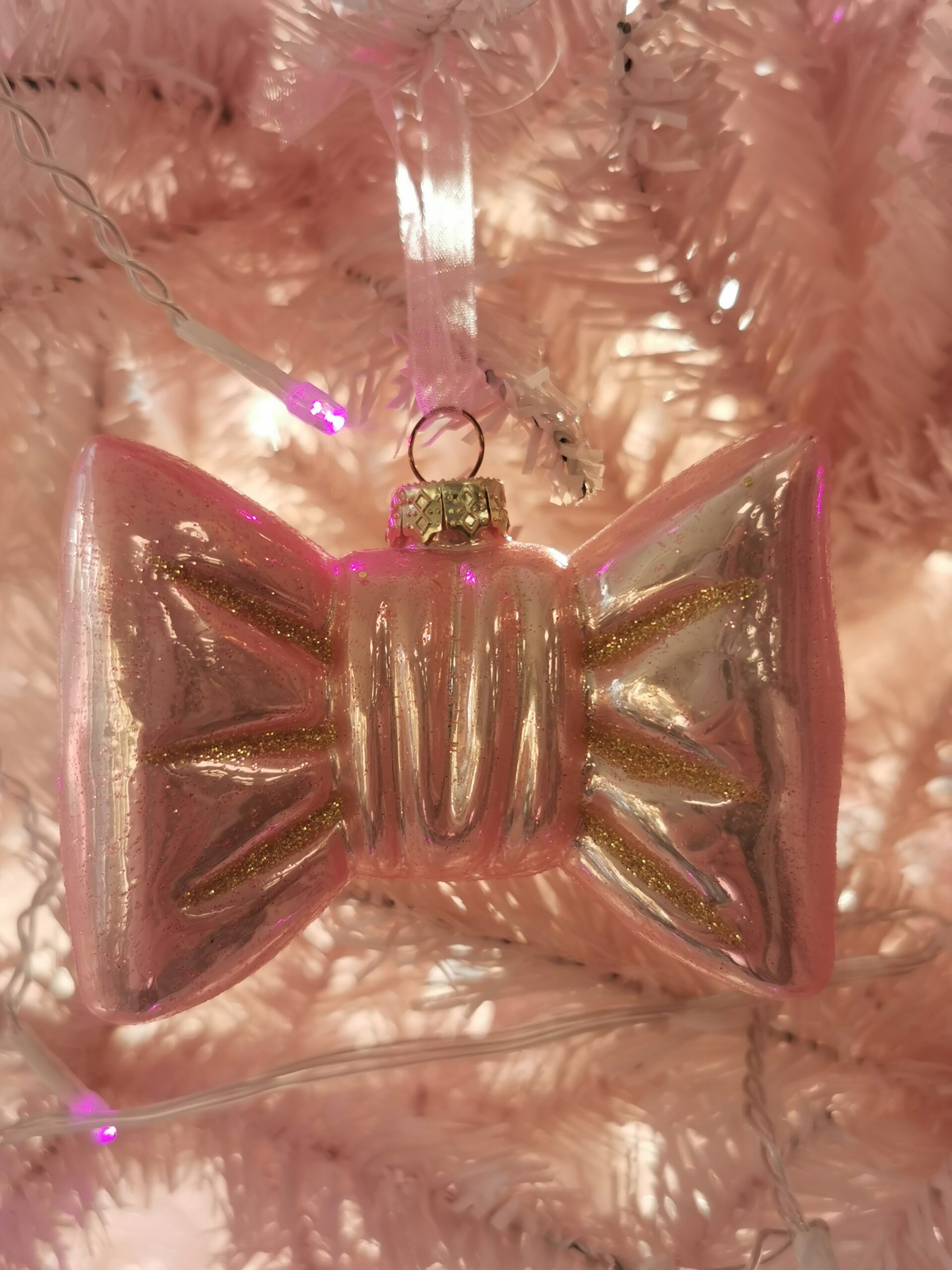 Rožinis stiklo žaisliukas bantuko formos. Tobulas puošti Kalėdų eglei, arba dekoruoti dovanos įpakavimui.
